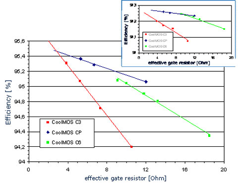 新型CoolMOS™ C6产品系列的效率显著高于前代C3系列产品,接近开关速度极快的CP系列产品。对于CoolMOS™ C6产品系列,效率受栅极电阻的影响相对较小。