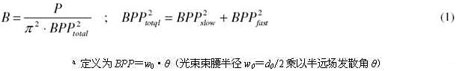 由多个半导体激光器bar条构成的高功率半导体激光器系统的另一缺点在于相对较差的光束质量和亮度B,公式(1)是B的定义。半导体激光器光束的亮度由激光功率P以及慢轴和快轴方向上的光束参数乘积(BPP)a所确定。[3]