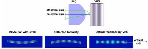 克服smile效应灵敏度的一种方法是将光栅结构集成到FAC中。[12]这样的元件对smile效应和非准直并不敏感。由于未经准直的光束具有更大的发散角,加之光栅的小角度选择性,因此只有一小部分光束被反射回半导体激光器腔内。在未准直或是存在smile效应的情况下,另外一部分光束将被反射用于提供反馈。与此相反,将光栅集成到FAC中,这种方案的一个理想情况是具备精确的准直且没有smile效应,此时几乎所有从VHG反射的光都被耦合至半导体激光器腔内。另一方面,这意味着要得到有效的波长锁定,VHG-FAC的反射率需要大幅提高到70%。