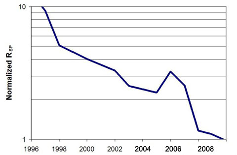 在二十世纪九十年代中期以前,因为传导损耗(I2R)仍是总功耗的主要成分,低压功率MOSFET的开发焦点一直放在RDS(ON)上。随着开关频率的上升,研究人员开始逐渐关注栅极电容和栅极电荷。图2所示为功率MOSFET品质因数(归一化 RSP 和RSP•QGD)的变化趋势。在过去14年间,这些参数减小了近10倍。