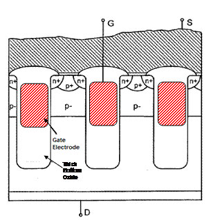 业界已开发出数种能够减小导通阻抗和栅极电荷的新技术,其中一种技术就是在栅极沟槽底部采用一层加厚的氧化层(图3)。这种方案不仅有助于降低栅漏电容(CGD),还能增大漂移区的阻抗。它也有利于降低导通阻抗和栅极电荷,因为现在可以一方面通过薄栅极氧化层来获得更低的Vth(阈值电压)以及更低的导通阻抗,同时又可以在沟槽底部采用加厚氧化层以获得较低的CGD。