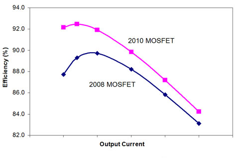 上一代降压转换器采用肖特基二极管和60V额定电压的功率MOSFET,效率为80-85%;而现在使用功率MOSFET产品,即使处理器输入电压下降,也能够获得90%以上的效率。