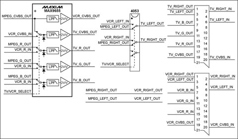图1展示了基本应用框图。MAX9655与简单的4053型模拟多路复用器一起使用,构成双SCART机顶盒的音频/视频切换电路,图3 (下图)给出了相应的电路原理图。
