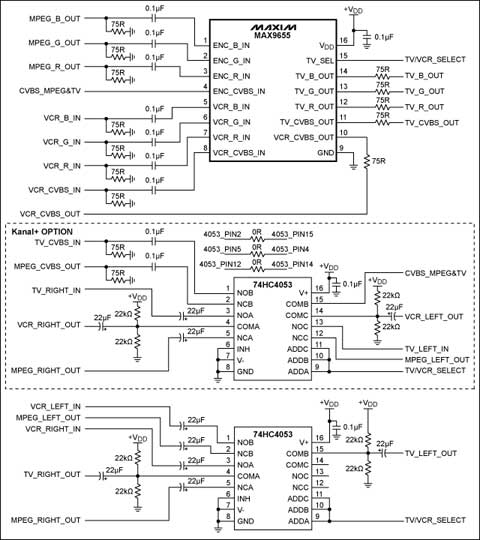 图1和图2所示设计说明了MAX9655在双SCART机顶盒中的应用。如果不需要Kanal+支持,推荐使用图1电路;需要Kanal+支持时,可使用图2电路。根据对Kanal+的要求,可以安装额外的4053或3个跳线。