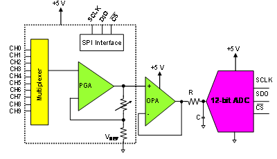 解决这个问题的一种可行方案是一个 10 通道、可编程放大器 (PGA),它与一个中速 12 位 SAR ADC(请参见图 1)配合工作。该单电源、10 通道 PGA 具有一个轨至轨的输入/输出,增益调节范围为 1 V/V 到 200 V/V。PGA 的 12 nVÖHz @ 10 kHz 低噪声性能适合于 12 位系统。这两个器件之间的模拟接口包括一个缓冲结构的运算放大器 (OPA) 以及一个 R/C 电路。12 位 ADC 是一个带固有采样和保持的电容型 SAR ADC。该转换器要求 R/C 电路,其可简化 ADC 输入结构的充电动作。