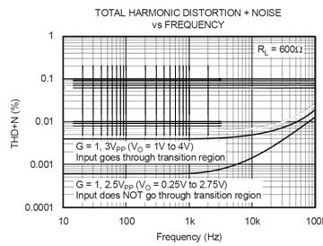 放大器的输入噪声是影响 THD+N 规范的另一个因素。高级别的输入噪声和/或高闭环增益都会增加放大器的总 THD+N 水平。