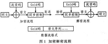 数据传输时,加密端和解密端使用同一个初始密钥,加密时密码流与明文相异或得到密文,同时每隔一定时间加入同步数据;解密时以同步模式产生的密文与密码流进行异或得到明文,同步模式采用63位Gold码。整个加解密过程与发送数据格式如图1所示。在发送密文中加入初始同步码,接收端利用Gold码的三值特性检测Gold码实现同步数据。对接收数据流和Gold码做互相关运算,相关结果满足Gold码的三值特性,说明当前数据流是发送端加入的同步Gold码.标志为密文的起始,然后调用解密算法对后续的密文解密,恢复传输的数据。