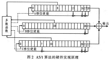 A5/1引是GSM移动通信中数据传输的流密码加密算法。A5/1密码流产生器生成的密码与明文数据帧的每一位相异或得到密文序列。A5/1算法由3个不同长度的线性反馈移位寄存器R1,R2,R3组成,其长度分别为19,22,23位,其反馈特征方程分别为:x18+x17+x16+x13+1,x22+x21+x20+x7+1。算法的初始密钥是64位向量。密码流输出位为3个移位寄存器的异或输出。移位寄存器的使能由多数函数控制。Rl的第8位、R2的第10位、R3的第10位为多数函数数据输入,它们决定3个移位寄存器的移位状况。在这3个数据位中,如果有两个或两个以上的都为0,多数函数值就为0;如果有两个或两个以上的都为1,多数函数值就为1。多数函数输入的3个数据位中与多数函数值相同,相应的移位寄存器就移位。A5/1的硬件实现原理如图2所示。密码流的产生分两个阶段.第一阶段给寄存器装人64位初始值;第二阶段则根据时钟节拍和使能控制产生密码流。