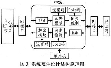 该系统硬件设计由单片机,FPGA和El接121等组成,如图3所示。单片机用于输入用户初始密钥;FPGA负责密钥流产生以及加解密;E1接口实现数据流的发送和接收,完成HDB3码和TTL电平之间的转换,实现通信接口单元和协议数据处理单元之间的全双工通信。