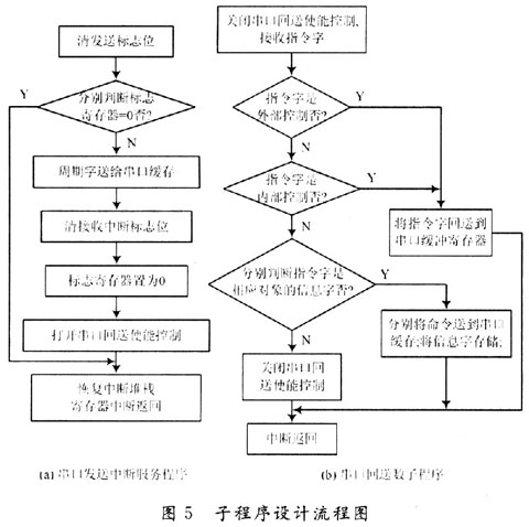 EPLD也要判断收到的指令来自单片机还是雷达系统,如果是单片机,则接收来自调试计算机的指令;否则,直接接收来自雷达系统的控制指令。单片机的程序设计主要分为四部分:程序初始化、串口接收中断服务子程序、串口发送中断子程序和串口回送数据子程序。后两者子程序设计流程示意如图5所示。其中,指令字包含的信息分别为开关状态码、阵面回数信息、阵面回数状态、阵面自检信息、移相值和衰减值。
