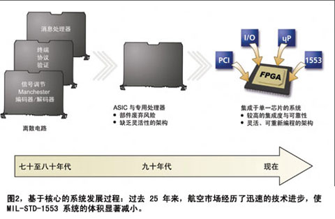 像其它军用网络技术一样,航空电子市场中的 MIL-STD-1553 测试和仿真实施也经历了从庞大的 DEC Unibus 卡到 19 英寸的通过机架安装的组件,又发展到用于 VME 和 PCI 系统上的较小、较为集成的多通道背板,现在又出现了更小、集成度更高的 PCMCIA 接口。图 2 描述了专用的 MIL-STD-1553 ASIC 芯片制造商的实施从离散的协议和收发器芯片组精简到单一的体积小、功耗低的 ASIC 的发展过程。