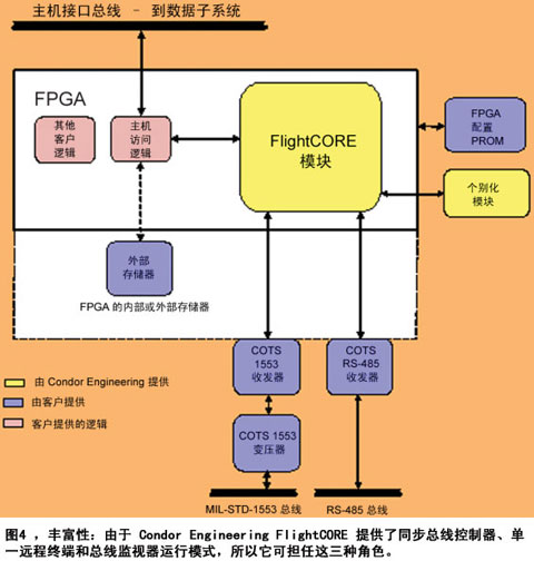 现代 FPGA 的强大功能使其成为 MIL-STD-1553 设计的理想选择,这就是 Condor Engineering 推出 FlightCORE 的原因。FlightCORE 是一种允许设计人员在各种 Altera 和 Xilinx 的 FPGA中轻松实现无版权的实例化设计的 MIL-STD-1553 IP。多数情况下,利用Xilinx 综合技术 (XST) 或 Altera Quartus II 集成综合技术 (QIS),FlightCORE 1553 可以在两天内成功地集成。如图 4 所示,用户只须将 Condor Engineering 的 IP 核心与其自身逻辑和 Condor Engineering 的个别化模块 (3mm x 3mm) 集成,即可实现高性能的 MIL-STD-1553设计。FlightCORE 还允许开发人员选择存储器的大小以恰好地与其系统需求相匹配。图4还显示了可以实施内部存贮和/或外部双端口随机存贮器。该产品还提供了 Manchester II编码与解码、信息协议验证与合法化及为接口控制和编程实施简单的共享存贮架构等所有的必要组件。只需增加外部收发器即可,如标准的COTS MIL-STD-1553或RS-485收发器。