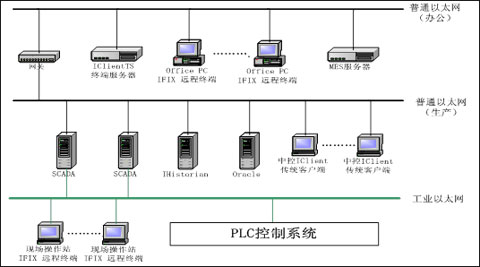 在总体系统框架中,网络划分三层,即办公网,生产网(普通以太网和工业以太网);生产网和办公网实现两网分离,保障系统安全,工业以太网采用环型结构,保证通讯可靠稳定。在中控部署了两台iFix SCADA服务器,采用双冗余技术,提高系统稳定性,在部署iFix客户端时,均衡连接服务器,优化服务器系统资源。部署一台Proficy Historian服务器,作为制丝生产过程数采服务器,在两台SCADA均安装PROFICY HISTORIAN采集器,一采集器为主,一采集器为备,实现过程数据采集的双冗余,保证过程数据的完整性。在传统IFIX客户端/服务器架构的基础上,引入GE瘦客户端解决方案iClientTS,采用Terminal技术和远程桌面协议,实现制丝集控系统远程监控,形成一套完整的制丝集控系统构建方案。