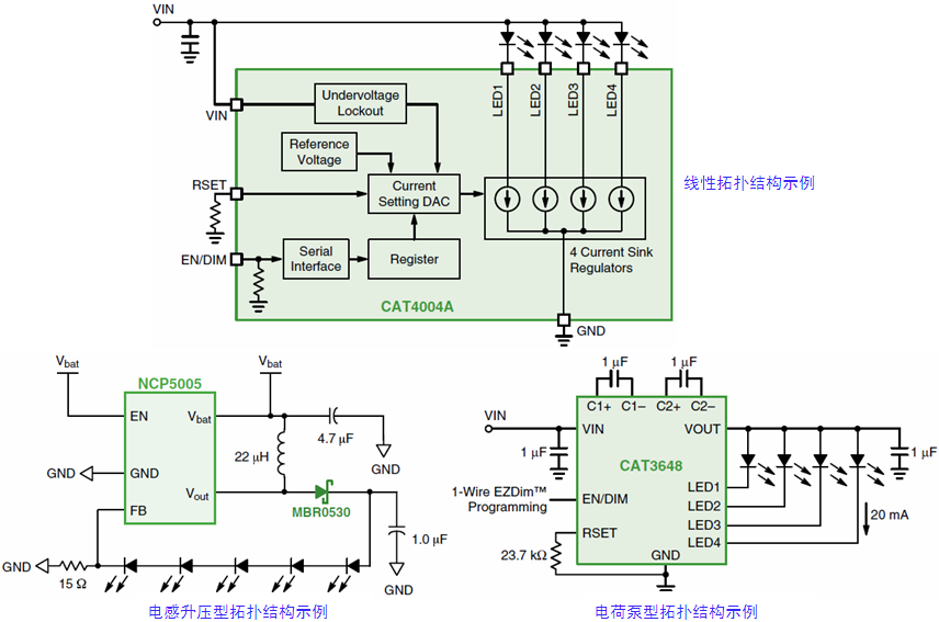图1:低压便携设备应用的不同LED驱动器拓扑结构示例
