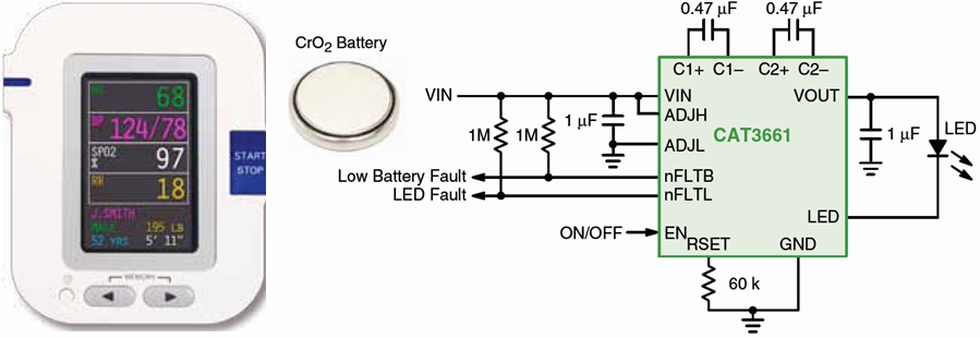 图4:针对扣式电池优化的CAT3661 LED驱动器应用电路图。