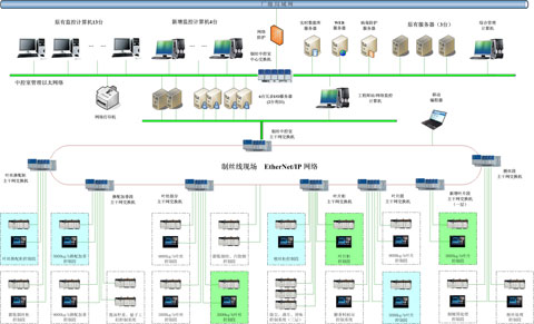 为了满足青岛烟厂分组加工柔性制丝线的需求,系统由IO服务器、集中监控计算机、现场操作计算机、历史数据库服务器、关系数据库服务器和WEB发布服务器构成。系统的结构如下图所示: