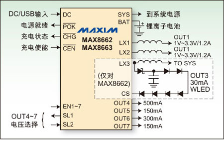 一些PMIC厂商在单芯片中集成了大量的功能。例如,Maxim公司的MAX8662集成了1个USB/AC充电器和2个步降DC/DC转换器、4个LDO及1个步升转换器,可支持多达7个WLED或OLED显示器。2个步降转换器可用来支持1.2A和900mA的一系列负载。对于噪声敏感的电路,4个LDO支持150mA 到 500mA的全线范围负载。