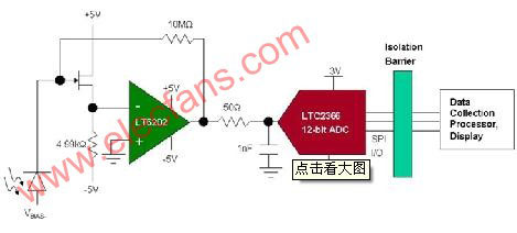 LTC2366采用ThinSOT 6引脚或8引脚封装(8.1mm2),有助于脉搏血氧计的总体解决方案尺寸保持较小。在3Msps时,它具有足够富裕的采样带宽,能够通过放大器和光电二极管电流正确地采样电压。LTC2366在单3V 电源下工作,可由单节锂离子电池、多节AA电池或者希望以低功率运行的墙上供电系统供电。