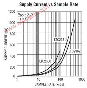 图2:LTC236x ADC功耗随着采样率减小而迅速降低