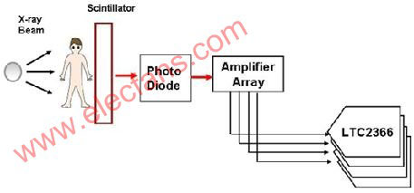 数字X射线一般需要至少12位分辨率和1Msps或更高采样率的ADC。这种ADC必须有高于或等于刷新率乘以阵列大小所得数值的采样率。这种应用一般需要多个ADC以分辨来自闪烁体的所有光电二极管或CMOS成像电流。一组光电二极管、放大器和ADC用来对整个阵列采样,如图3所示。当多个ADC放置在一个空间受限的区域内时,有一个具有快速串行数据通信功能的低功率SAR ADC至关重要。基于73dB信噪比和零数据延迟的LTC2366(3Msps)和LTC2365(1Msps)就非常适合数字 X 射线成像使用。