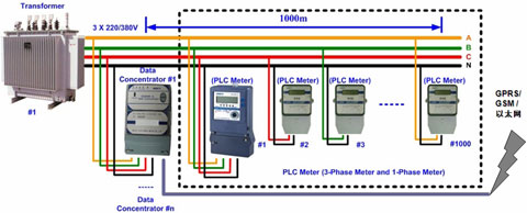 PLC智能电表应用涉及PLC电表(单相或三相)、数据集中器、耦合变压器及相关电缆等组件。图1显示的是典型的PLC智能电表网络示意图。由图可见,为数众多的PLC智能电表通过电力线连接至数据集中器,然后再藉GPRS、GSM或以太网等方式将数据从集中器传送至电力机构的数据中心。