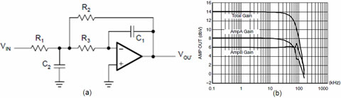 图3:NCS5650的输入预放大器电路图(a)及4阶低通滤波效果(b)。