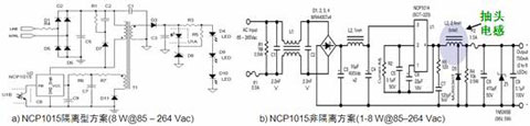 图1:基于NCP1015的1 W至8 W隔离型(a)及非隔离型(b)LED照明方案