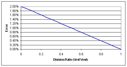 图 2 输出精度很直观:(1-Vref/Vout)*2*容差(显示的 1% 电阻)