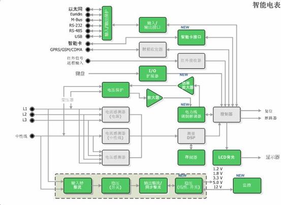 安森美半导体应用于智能电表的方案包含一系列标准产品、专用标准产品(ASSP)及专用集成电路(ASIC),可以提供智能电表的4种基本功能,包括:电源/电源管理、计量、寄存及通信,具体产品包括功率因数控制器、交流-直流(AC-DC)控制器、直流-直流(DC-DC)控制器、稳压器,MOSFET、整流器、三端双向可控硅开关元件(TRIAC),PLC调制解调器、线路驱动器及信号放大器,滤波、输入/输出(I/O)及数据保护,LCD背光驱动器,EEPROM存储器,及智能卡接口等。图2是由安森美半导体的多种器件(图中绿色部分)构成的智能电表应用。