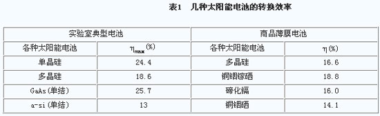 在太阳能发电系统中,系统的总效率ηese由电池组件的PV转换率、控制器效率、蓄电池效率、逆变器效率及负载的效率等组成。但相对于太阳能电池技术来讲,要比控制器、逆变器及照明负载等其它单元的技术及生产水平要成熟得多,而且目前系统的转换率只有17%左右。因此提高电池组件的转换率,降低单位功率造价是太阳能发电产业化的重点和难点。太阳能电池问世以来,晶体硅作为主角材料保持着统治地位。目前对硅电池转换率的研究,主要围绕着加大吸能面,如双面电池,减小反射;运用吸杂技术减小半导体材料的复合;电池超薄型化;改进理论,建立新模型;聚光电池等。几种太阳能电池的转换效率见表1。