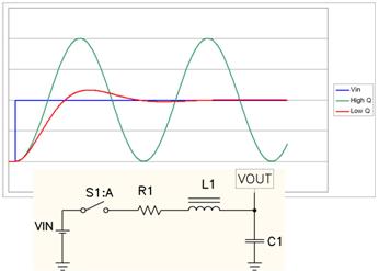 高 Q(低阻尼)系统为无阻尼,而滤波器输出电压可振铃至两倍输入源 (Vin)。低 Q 系统会限制峰值振铃电压。