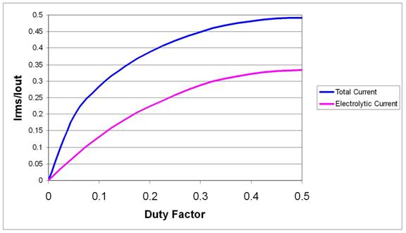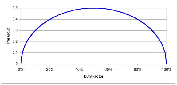 图 1 给出了该表达式的曲线图;它是一个圆形,其中,50%占空比时达到较大值0.5,并在 0% 和 100% 占空比时有 2 个零交叉。该曲线在 50% 占空比附近对称。在 20% 和 80% 之间,RMS 电流和输出电流之间的比大于 80%。使用这一范围的占空比,您可以将 RMS 电流粗略估计为 1/2 较大输出电流。在这一范围之外,您需要进行相应的计算。
