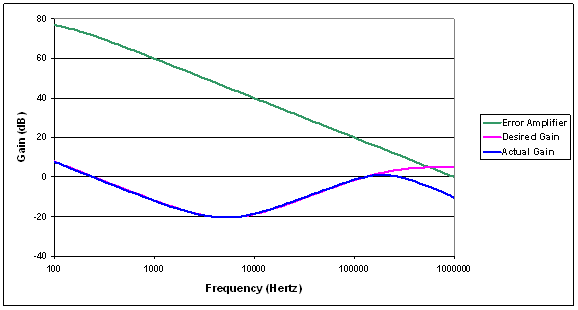 第二种常见错误是让放大器提供超出其能力范围的增益,图 2 描述了这种错误。它显示了理想的误差放大器频率响应、放大器的增益以及给定误差放大器限制的预计性能。由于其带宽限制的存在,放大器无法给出理想的高频增益。尽管图中未能显示,但相位也受到严重的影响。电压模式转换器(如图 1 所示)中需要高频大增益,这时问题会更加突出。设计误差放大器补偿时,请特别注意其带宽限制,否则您较终需要使用一个震荡电源。
