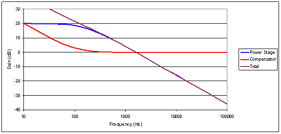 在电源的光耦合器和电流模式控制部分,您的确可以通过增益实现一定的控制。红色曲线是输出电压到功率级输入的响应。利用补偿积分电路,在对电源进行补偿的程度方面您会受到一定的限制。在高频率下,Vout 到功率级输入的增益等于 1。您唯一的选择是在哪里放置零。其由积分电路变为 1 的位置决定。图 2 中,补偿零与总单极衰减的功率级极一致。请注意,由于补偿增益为 1,因此电源的交叉频率由功率级本身的 0 dB 交叉设置。