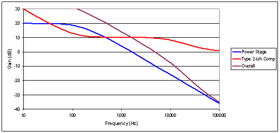 很多时候,积分电路并不会为要求瞬态响应提供充足的带宽。一种简单的改进方法是将 1 型误差放大器布局转变为 2 型。2 型增加了一个与积分电容串联的电阻,之后增加一个并联高频电容,以用于二极、一零频率响应。图 3 显示了 2 型放大器的更新频率响应。这种情况下,首个零时我们并没有被限于 0 dB 增益,并且我们还可以设置 10 dB 增益。这样就允许将交叉频率(两条曲线的和等于 0 dB)从 2 kHz 增加到 6 kHz。另外,需要注意更高频率特性。我们在交叉频率以上放置了一个极,以降低电源的噪声敏感度。正如简单积分电路中一样,通过补偿部分的增益绝不会降低至 0 dB 以下。