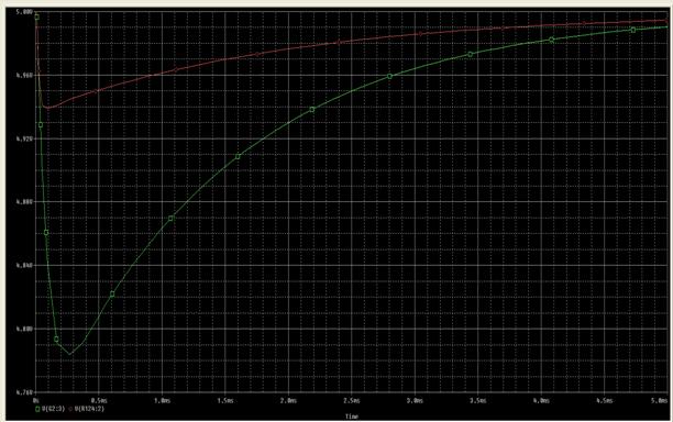 由 2 型误差放大器实现的更高交叉频率改善了瞬态负载响应。图 4 显示了利用两种具有图 2-3 所示频率响应特性的设计带来的改善状况。电路在 P-Spice 中得到仿真,并且两个电路均使用同样的负载阶跃。如我们预料的一样,3 到 1 的带宽提高转换为 3 到 1 的输出电压波动减小。