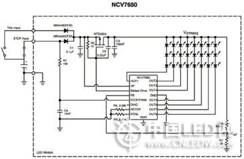 NCV7680集成了众多功能,支持两个亮度等级,一级用于停车,另一级用于尾部照明。如果需要,也可使用可选的脉宽调制(PWM)控制。系统设计人员只需使用一个外部电阻设定输出电流(整体设定点)。另外,针对要求大电流的设计,可选的外部镇流器场效应晶体管(FET)可以根据设计所需的高电流进行功率分配。延迟的功率极限降低了在过电压状态下的驱动电流。这对于没有外部FET的低电流应用来说十分重要。