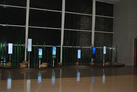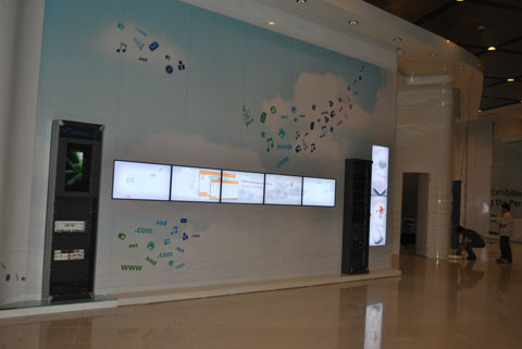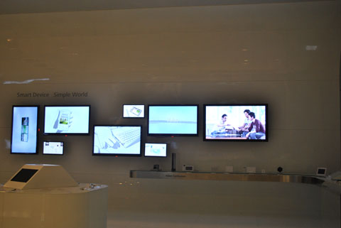 在七百多平米的华为展示厅,各类显示终端琳琅满目、应有尽有(包括全高清的各尺寸显示器、拼接墙、触摸屏)。展示厅内仅需通过Avedia播放器的自带接口与这些显示终端相连,就可以完成整个信息发布系统的前端建置。