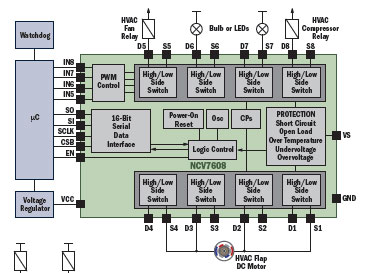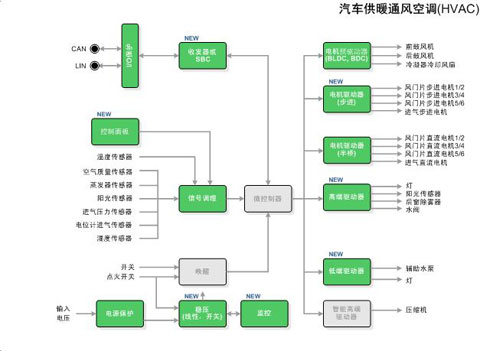 这里以车身暖通空调((HVAC)的控制、通信和电源,以及直流电机驱动器为例介绍。