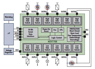 六路半桥式驱动器NCV7708就是一种灵活的单面高/低端驱动器。其六个高端和低端通道专门用于电机控制配置,如半桥或全桥。NCV7708可以通过一个16位SPI接口控制5个直流电机。该器件还可以控制继电器或指示灯。图2是该器件的功能框图。