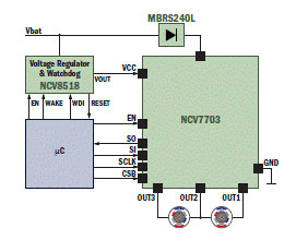 三路半桥驱动器NCV7703可以控制两个直流电机。功率级的内部连接作为半桥使用,采用SO-14封装的器件可有效减少引脚数量。图3是该器件的框图。