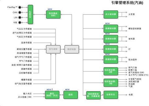 安森美半导体为汽油引擎、双燃料/弹性燃料(bi/flexfuel)和柴油引擎开发了各种定制和标准产品,范围覆盖从点火控制的供气和供油到排气后处理子系统的众多应用。这些产品组合包括:电感式角度传感器接口、压力传感器接口、爆震和轮速检测电路、油/尿素流(urea-flow)和气流接口、车载网络组件、油门执行器驱动器和前置驱动器、电磁和压电燃料喷射系统、火花点火、风机、泵和液压控制。图6是汽油引擎管理系统的框图。此外,安森美半导体还提供柴油引擎管理系统,以满足柴油引擎在欧洲和北美地区持续增加的需求。