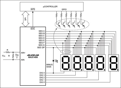除了内部20位ADC和7段显示驱动器外,MAX1499还集成了SPI™接口,该接口用于访问ADC的转换结果并控制整个LED显示。微控制器可以利用该接口方便地读取ADC结果,控制需要显示的内容。