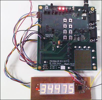 在第一位之前可以利用一个矩形LED作为减号,受控于不使用的小数点控制线。该应用可以选择任何带有外部中断、SPI接口和足够的GPIO的微控制器。测试装置包括MAX1499面板驱动器IC (安装在显示板上),由低功耗RISC微控制器(MAXQ610,安装在评估板上)控制(图6),可下载系统固件。