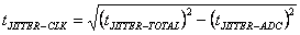 方程式 1 让您能够计算出特定 ADC 的要求时钟抖动估计值。例如,一个 70 dB SNR 的 ADC,输入信号为 100 MHz,您可以计算得到 tJITTER_TOTAL 的值为 503 微微秒。如果输入 ADC 孔径抖动为 150 微微秒,则由方程式 2 可得到一个较高的外部时钟抖动要求估计值。
