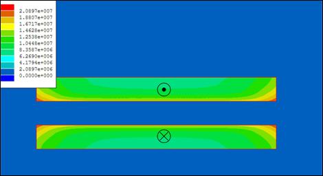图 2 显示了自由空间中扁平导体的电流分布。它趋向在窄边中流动,而非导体表面都相等。但是,它仍然具有相同的渗透深度。这大大地增加了电阻,因为导体的大部分都具有非常低的电流密度。