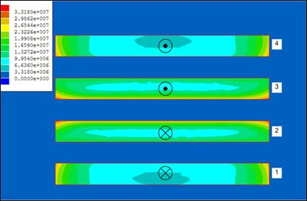 图 4 显示了一个层缠绕结构的横截面。其中,较上面两个导体(3 和 4)携带相同方向的相同电流,而较下面两个(1和2)携带与上面各层方向相反的相等电流。这可以代表 2-2 匝数比变压器的层。如前面例子所述,绕组的电流被吸取至相对面。然而,出现了一种有趣的现象。在绕组 1 和 4 中,电流被吸取至内表面,它在方向相反的绕组 2 和 3 上引起电流。绕组 2 和 3 的总电流正以反向流动,因此内表面上的电流密度更大。这种现象被称为邻近效应,其会使高频工作的层结构出现问题。解决这一问题的一种方法是重新安排导体叠放,对绕组交错以让电流在两端以正确方向流动,而非使用具有同向电流的两个邻近层绕组。