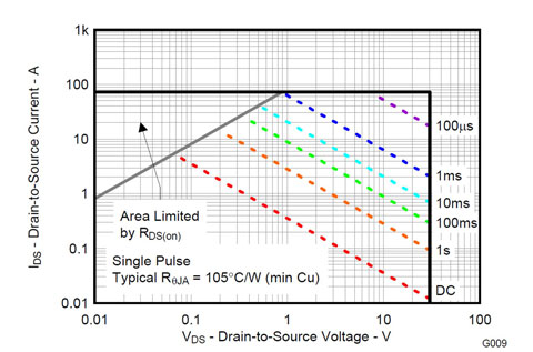 图 1 MOSFET SOA 曲线表明了允许能耗的起始点