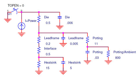 该模型以左上角一个电流源作为开始,其为系统增加热量的模拟。电流流入裸片的热容及其热阻。热量从裸片流入引线框和封装灌封材料。流经引线框的热量再流入封装和散热片之间的接触面。热量从散热片流入热环境中。遍及整个网络的电压代表高于环境的温升。