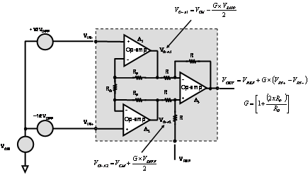 需要注意的第一个条件是施加到仪表放大器的输入电压(VIN+ 与 VIN)(请参见 1)。该电压等于共模输入电压加上或减去差动输入信号。A1 和 A2 的输入级会限制这两个输入电压的范围。较大和较小输入电压极限值因器件不同而不同,因此需要查询产品说明书以获得较准确的信息并注意您的电源电压。